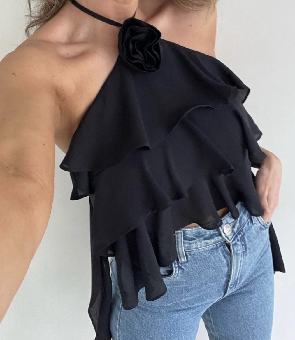 Blusa frente única, com cordão para amarração no pescoço, shape soltinho com babados assimétricos. Acompanha acessório com aplicação floral para uso opcional. O tecido é leve e fluido, apresenta ótimo caimento. Não possui forro. Sem bojo.
