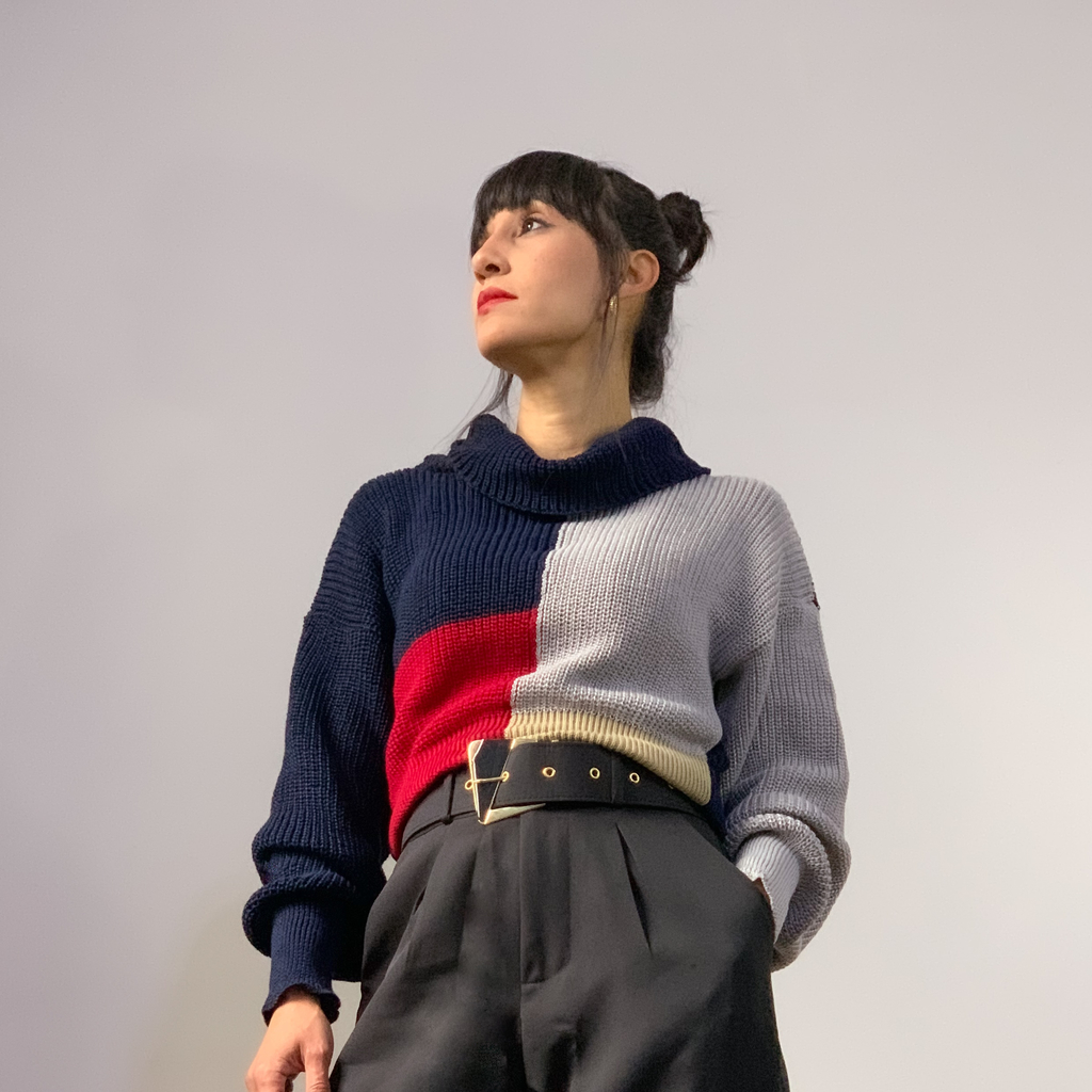 Blusa feminina confeccionada em tricot. Modelo amplo com ajuste na barra, comprimento médio, mangas longas e largas, justinhas no punho, gola boba. Padronagem geométrica em cores contrastantes na frente (vermelho, cinza e caqui). Uma peça linda e confortável para os dias mais frios.