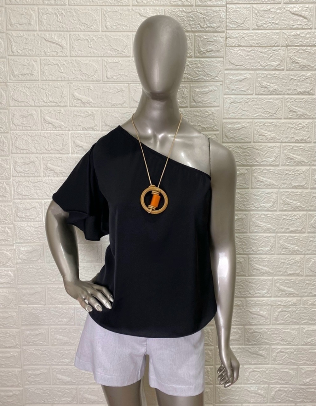 Blusa com decote assimétrico, manga única flare com comprimento curto, elástico no ombro para melhor ajuste no corpo, modelagem reta e shape soltinho. Confeccionada em tecido leve e fluido, apresenta ótimo caimento. Possui forro. Sem bojo. Uma peça básica, perfeita para compor looks estilosos e elegantes.