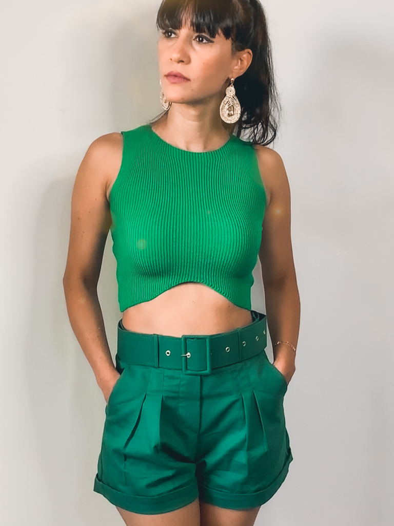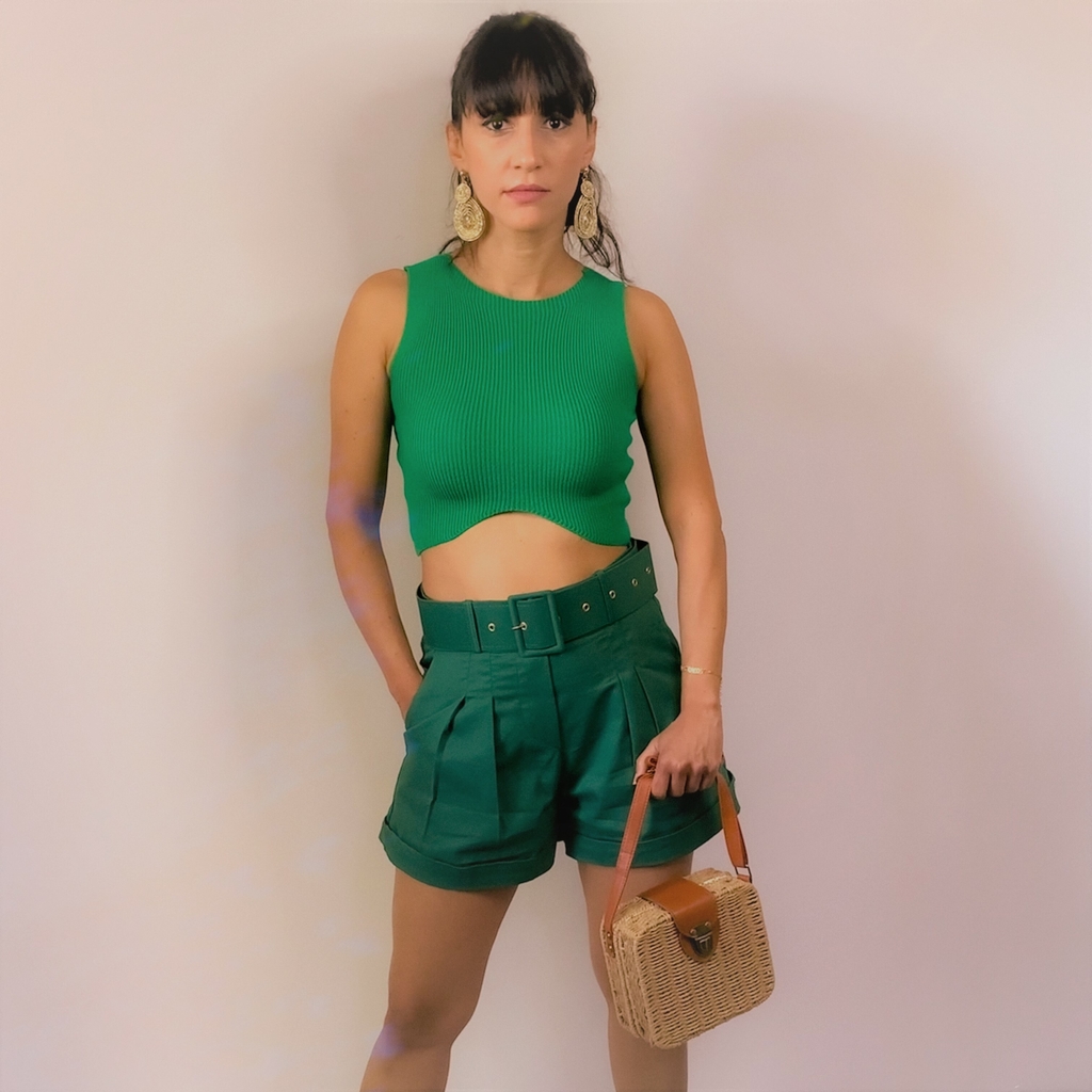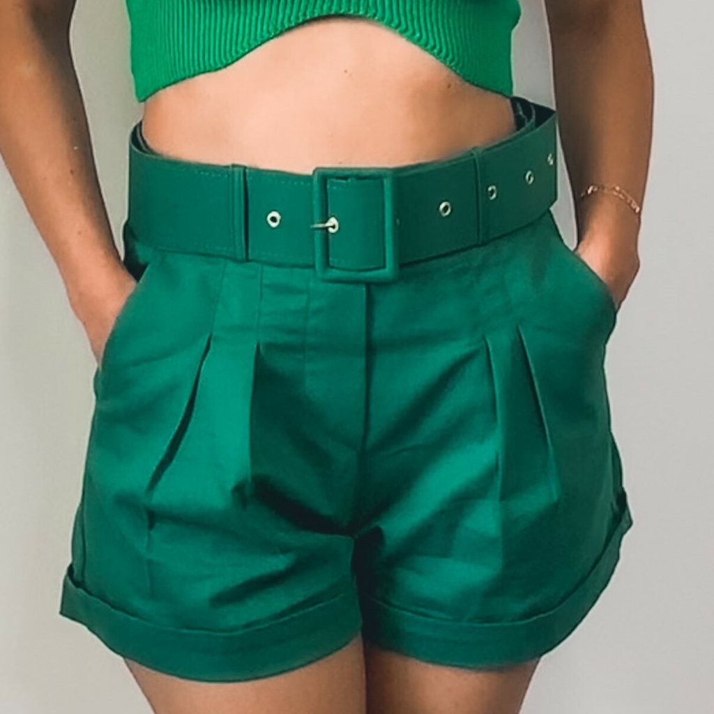 Shorts em tecido de alfaiataria. Modelo com cintura alta, barra italiana, cós com passante, cinto forrado com o mesmo tecido, bolsos faca na região frontal.