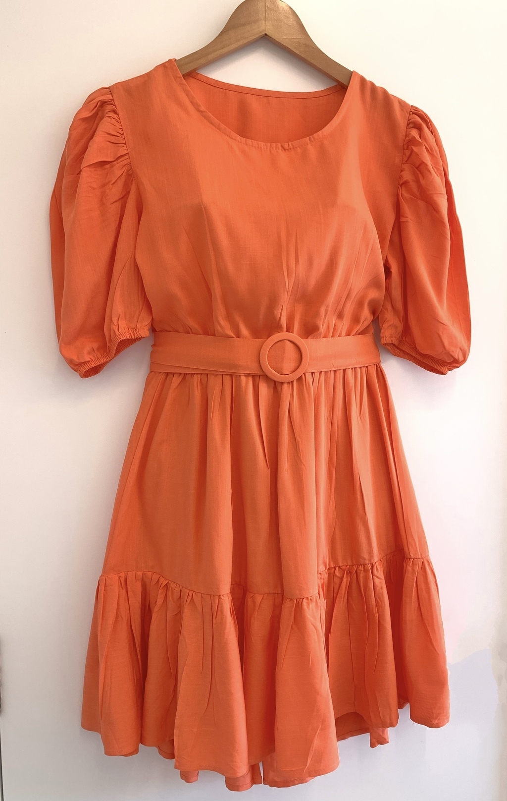 Vestido curto com shape soltinho e manga princesa. Possui decote redondo, elástico na cintura e babado na barra. Possui forro. Sem bojo. Modelo acompanha cinto confeccionado com o mesmo tecido.