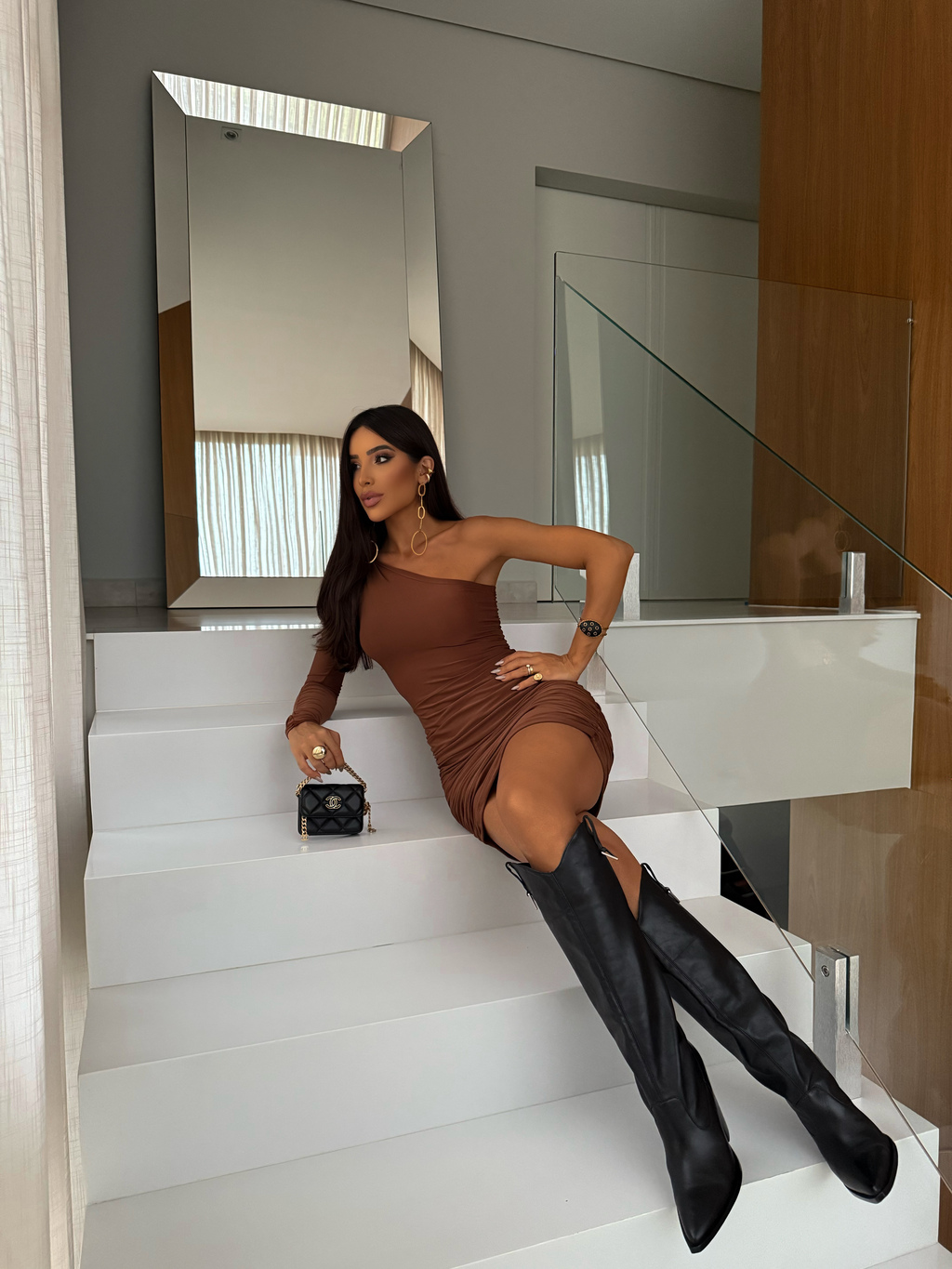 Vestido com comprimento curto, confeccionado em malha, forrado (possui tecido duplo no busto e na saia que evita qualquer transparência indesejada). Uma peça com decote assimétrico, manga longa única e modelagem justa que contorna o corpo e valoriza a silhueta. O detalhe drapeado nas laterais da saia adiciona um ar de modernidade e sensualidade à peça. Não possui bojo. Combine com salto alto e acessórios minimalistas para uma festa ou com botas e jaquetas para um visual mais casual chique.