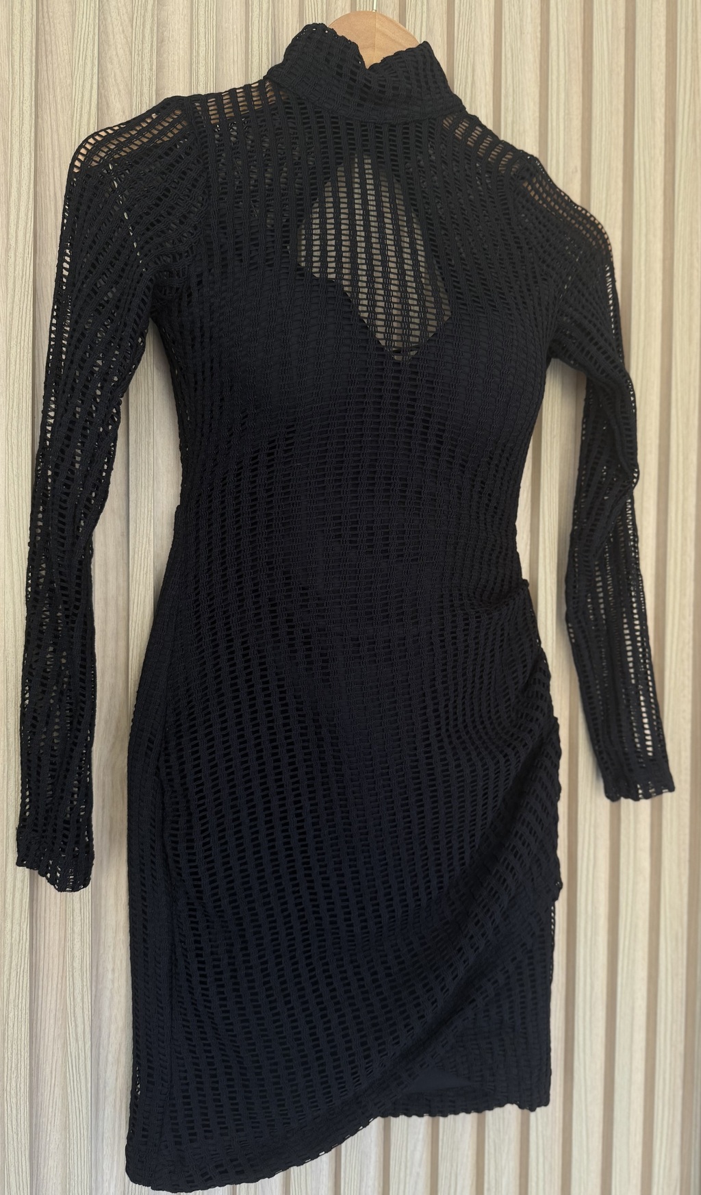 Confeccionado em crochê maquinetado, este vestido apresenta um comprimento curto e uma saia transpassada que valoriza a silhueta feminina. O tecido com elastano e a modelagem justinha proporciona um caimento perfeito, enquanto as mangas longas transparentes elevam o nível de sofisticação da peça.