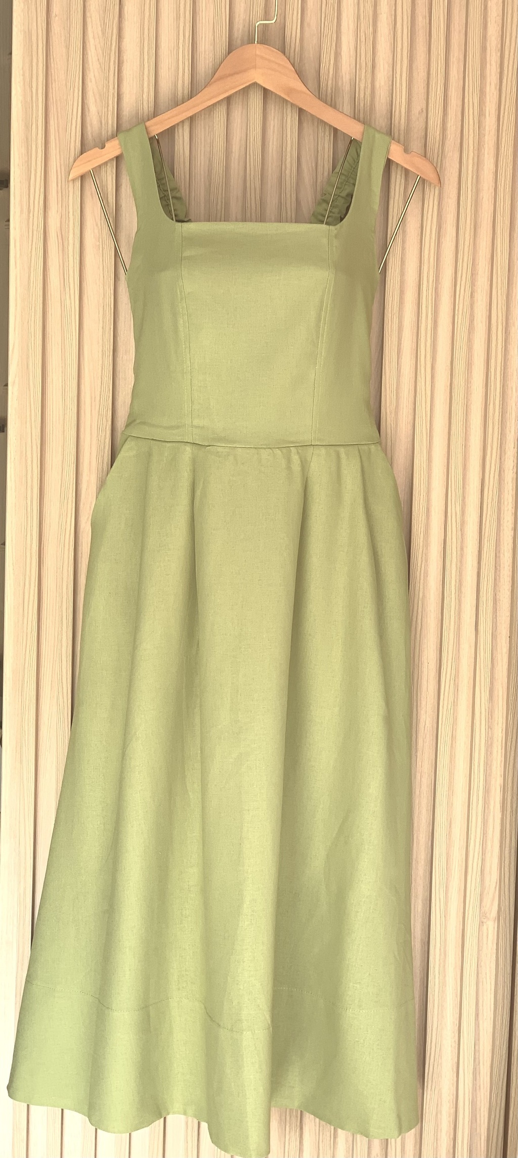 Vestido midi com decote quadrado, possui alças largas com elástico e lastex nas costas para melhor caimento no corpo. Saia com modelagem evasê, bolsos funcionais e barra larga. Possui forro. Não possui bojo.