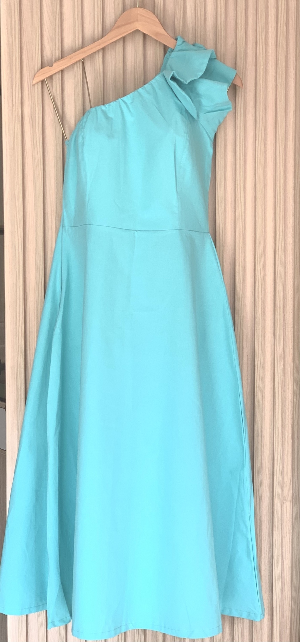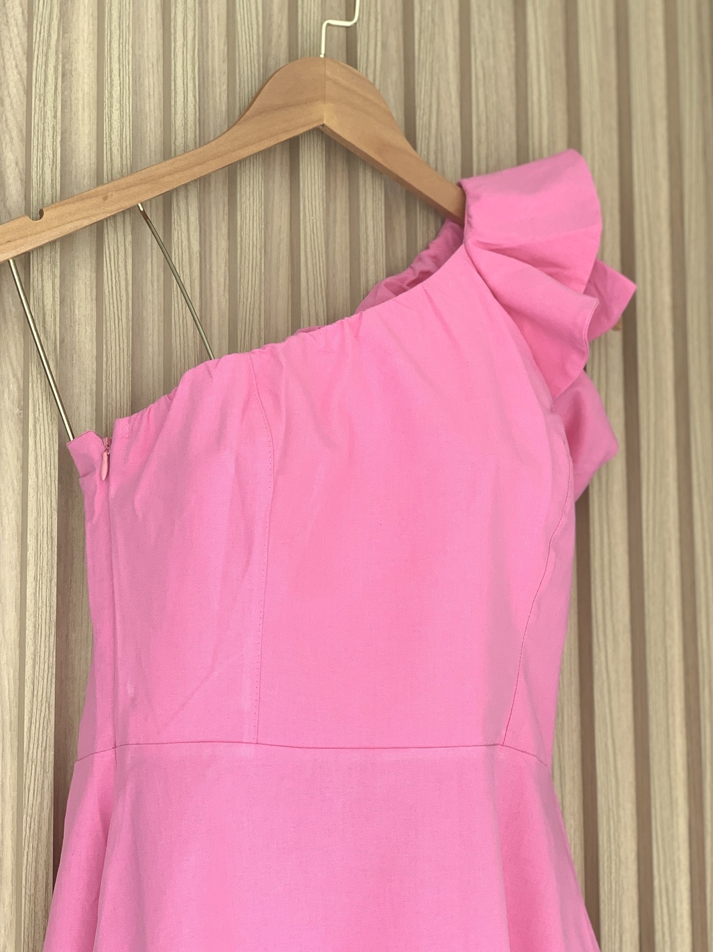 Vestido confeccionado em linho, com comprimento midi, decote assimétrico com elástico para melhor ajuste no corpo. Modelo com um ombro só, possui manga curta com babados. Modelagem evasê, acinturado com saia ampla. Fechamento lateral por zíper. Não possui bojo. Forro duplo no busto.